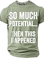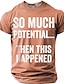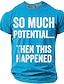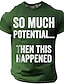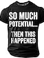 Camiseta engraçada e sarcástica com estampa "Homens com tanto potencial, e então isso aconteceu", humor autodepreciativo, frase engraçada, efeito desgastado, manga curta, design casual, tamanhos P, M,