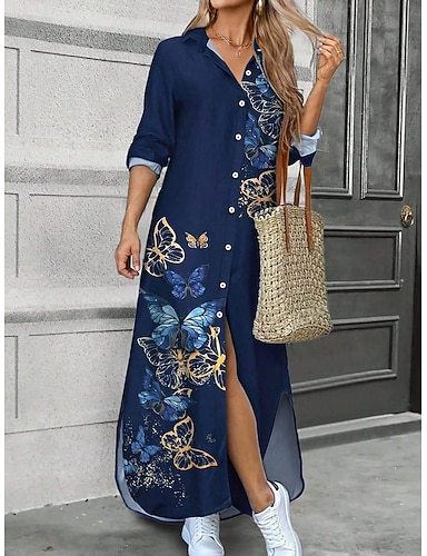 Mulheres Vestido Longo Vestido de turno Casual Diário Encontro Normal Gráfico Borboleta Manga Longa Colarinho de Camisa Branco Vermelho Azul Verão Primavera Outono
