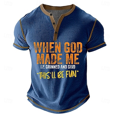 Camiseta Henley Engraçada Masculina de Manga Curta "Quando Deus Me Fez Ele Sorriu e Disse Isso Vai Ser Divertido"