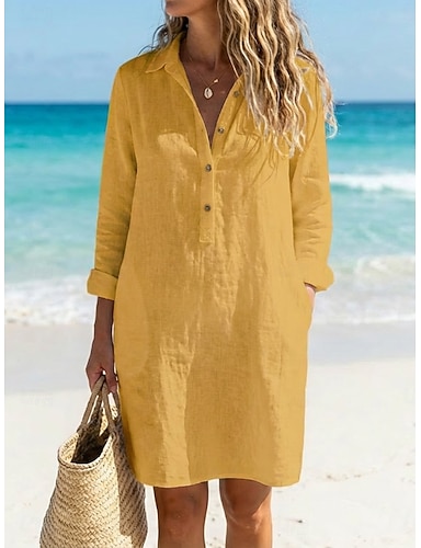 Mulheres Vestido no Joelho Linho de algodão sintético Camisetão Moda Moderno Ao ar livre Férias Feriado Normal Tecido Manga Longa Colarinho de Camisa Branco Amarelo Azul Marinha Verão Primavera