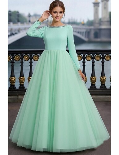 Linha A Longo Vestido de convidada de casamento Vestido formal Vestido de noite Vestidos de baile Elegante Manga Longa Decote Canoa Baile de Formatura Formal Tule Tecido Que Estica com Miçangas Cor