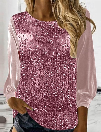 Mulheres Camiseta T-shirt Paetês Patchwork Côr Sólida Moda à moda Clássico Manga Longa Gola Redonda Tops regulares Diário Final de semana Rosa Primavera Outono