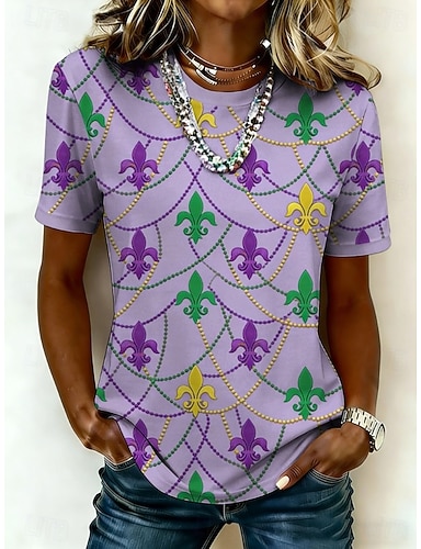 Carnaval Mulheres Camiseta Imprimir Gráfico Vintage Moda à moda Manga Curta Gola Redonda Tops longos Diário Preto Branco Verde Escuro Roxo Verão Primavera