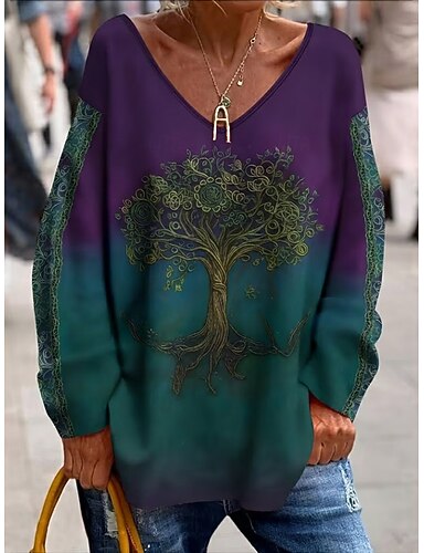 Mulheres Camiseta Imprimir Âmbar Floral Gráfico Elegante Moda à moda Manga Longa Decote V Tops regulares Diário Final de semana Branco Roxo Primavera Outono