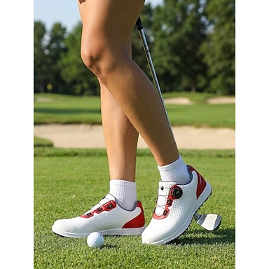 Sapatos de golfe femininos brancos e vermelhos – tênis de golfe com cravos, leves e respiráveis, para mulheres, com amortecimento estável para o campo de golfe, treino, caminhada e uso diário.