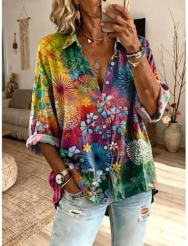 Mulheres Camisa Social Patchwork Botões Imprimir Floral Gráfico Elegante Boêmia Vintage Manga Longa Decote V Tops longos Diário Feriado Branco Verão Primavera