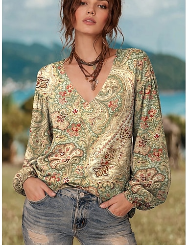 Mulheres Blusa Imprimir Gráfico Estampado Cashemere Elegante Vintage à moda Manga Longa Decote V Tops regulares Diário Feriado Azul Amarelo Rosa Roxo Verde Verão Primavera