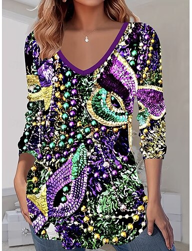 Camiseta Feminina de Carnaval Gráfica Abstrata Vintage Estilosa Casual de Manga Longa Gola V Regular Tops Diários Impressão Verde Primavera Outono