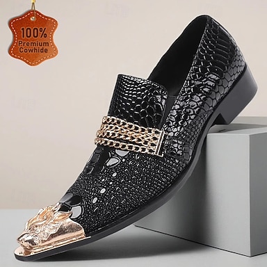 Mocassins masculinos pretos com estampa de crocodilo e detalhe de corrente, calçados slip-on modernos, ideais para eventos noturnos e ocasiões especiais.
