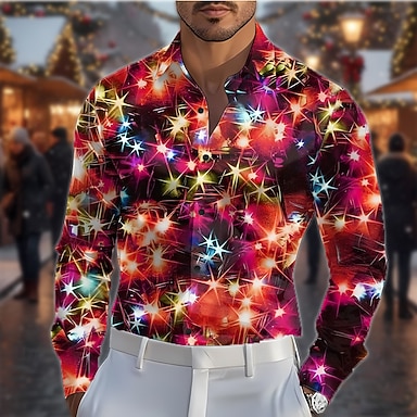 Natal Homens Luz de Natal Camisa Social Blusa de cetim Saia Manga Longa Moda Casual Festa Feriado Primavera Outono Aberto para a Lateral Impressão 3D Camisas de botões Vermelho Azul