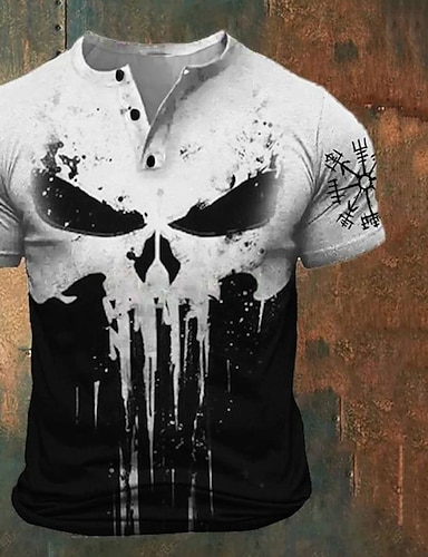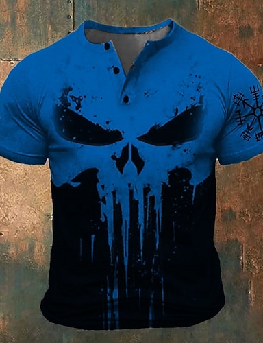 Homens Gráfico Viking Caveiras Camiseta Camisa Henley Manga Curta Impressão 3D Moda Clássico Retro Vintage Esportes Feriado Para Noite Primavera Verão Azul Branco Vermelho Verde Henley Camiseta Henley