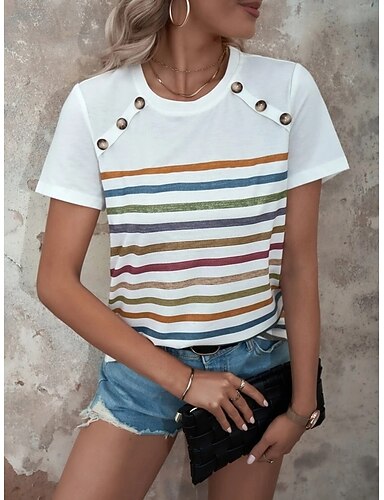 Mulheres Camisa Social Blusa Patchwork Botões Listrado à moda Clássico Moderno Manga Curta Gola Redonda Tops regulares Diário Feriado Para Noite Azul Preto Branco Vinho Verão Primavera