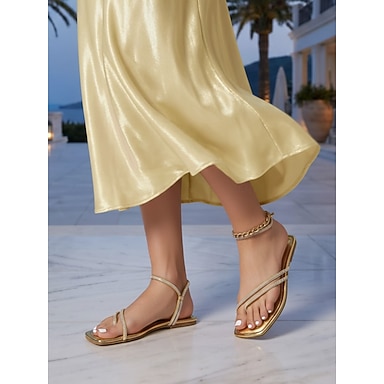 Sandálias rasteiras femininas elegantes – sandálias de verão douradas com tiras para as férias. &eventos noturnos