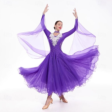 Vestido de dança de salão com strass para mulheres, ideal para festas, apresentações modernas, valsa, competições e trajes de palco. Manga longa.