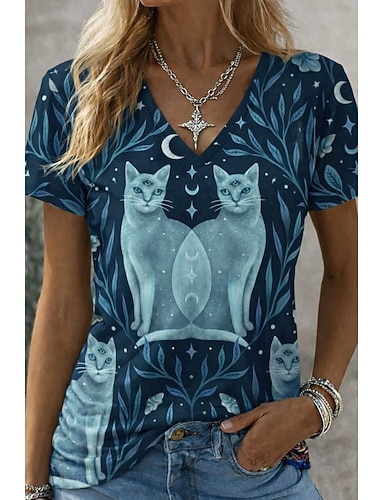 Camiseta feminina com estampa gráfica de desenho episódico, estilo vintage, clássica, manga curta, decote em V, tops regulares para uso diário, esportes, passeios, azul, primavera, outono e inverno.