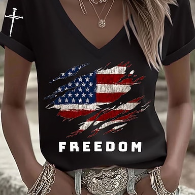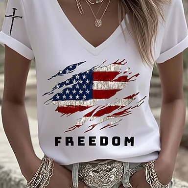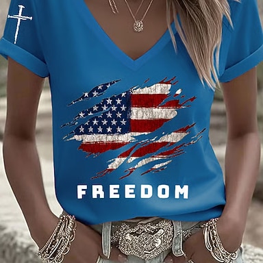 Dia da Independência Aniversário Americano Patriótico Camiseta Feminina Estampa Gráfica Bandeira Vintage Estilosa Clássica Manga Curta Decote em V Tamanhos Regulares Diários Azul Branco Azul Marinho