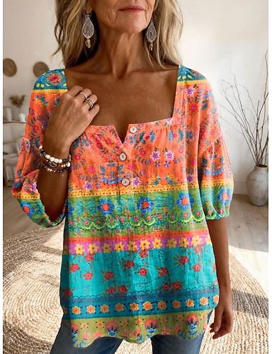 Mulheres Blusa Imprimir Floral Gráfico Diário à moda Básico Meia Manga Decote Quadrado Tops regulares Diário Amarelo Rosa Roxo Laranja Verão Primavera