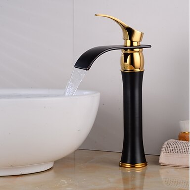 torneira da pia do banheiro, cascata vintage banhada a óleo dourada/preta conjunto central com alça única torneiras de banho de um furo com água quente e fria