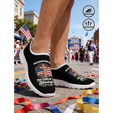 Tênis slip-on preto masculino com estampa patriótica – calçado leve e respirável para caminhada, com a bandeira americana e o desenho comemorativo dos 250 anos, ideal para uso casual, eventos