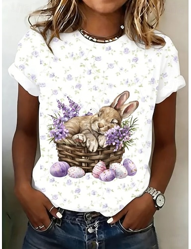 Páscoa Mulheres Camiseta Imprimir Gráfico Animal Moda à moda Clássico Manga Curta Gola Redonda Tops regulares Casual Diário Final de semana Branco Verão Primavera