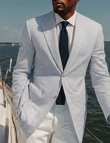 Homens Jaqueta Blazer Colar de entalhe Moda Leve Casual Listrado Blazer Blazer de algodão seersucker Rosa Azul Céu sábio Moderno Dois botões de peito simples