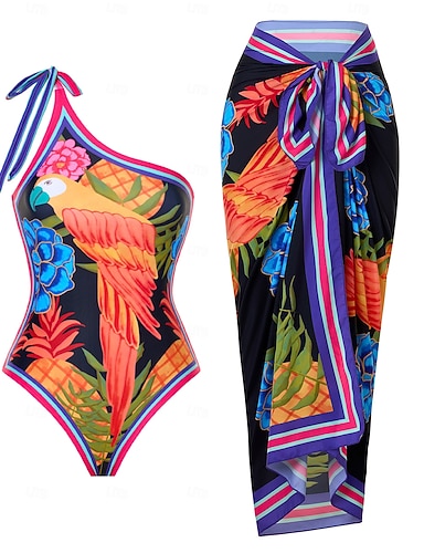 Mulheres Roupa de Banho Uma pedaço 2 partes Monoquíni Saia roupa de banho Compressão abdominal Cintura Alta Delgado Frente Única Férias Tropical Floral Gráfico Pescoço Assimétrico Sem Manga Fatos de