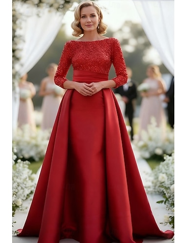 Tubinho Vestidos Longo Vestido de convidada de casamento Vestido formal Vestido de noite Vestido Para Mãe dos Noivos Manga 3/4 Barco Pescoço Elegante Festa de Casamento Cetim com Renda Apliques