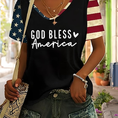 Dia da Independência Americana Mulheres Camiseta T-shirt Imprimir Gráfico à moda Clássico Casual Manga Curta Decote V Tops regulares Diário Para Noite Final de semana Azul Preto Branco Vermelho Verde