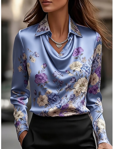 Mulheres Camisa Social Elegant Top de cetim Blusas de Seda Imprimir Com Pregas Floral Gráfico Elegante à moda Casual Manga Longa Gola Boba Tops regulares Diário Trabalho Feriado Azul Preto Rosa