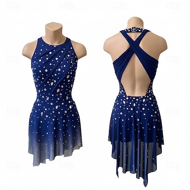 Vestidos para Patinação Artística Mulheres Para Meninas Patinação no Gelo Vestidos Azul Barra Assimétrica Com Transparência Elasticidade Alta Treino Competição Roupa para Patinação Clássico Cristal