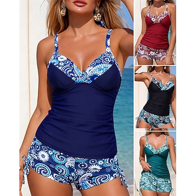 Mulheres Roupa de banho Tankini 2 Peças Estampado Boyleg Secagem Rápida Elástico Sem Manga Roupa de Banho roupa de banho Surfe Praia Natação Verão