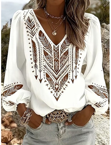 Mulheres Camisa Social Gráfico Geométrica Estampado Cashemere Boêmia Férias Vintage Manga Longa Decote V Tops regulares Diário Feriado Para Noite Azul Branco Castanho Claro Verde Verão Primavera