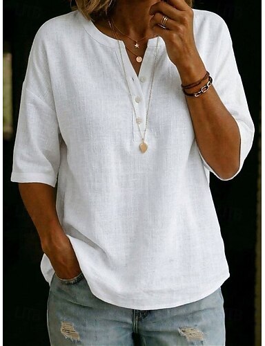 Mulheres Camisa Social Camisas de algodão e linho Blusa Linho de algodão sintético Botões Tecido à moda Clássico Moderno Sem Manga Gola Redonda Tops regulares Diário Feriado Para Noite Azul Preto