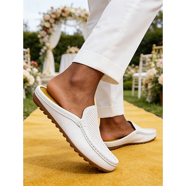 Mocassins mule brancos masculinos perfurados, sapatos sociais sem calcanhar, leves e respiráveis, ideais para noivos e padrinhos em casamentos na praia, cerimônias no jardim e recepções.