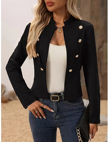 Mulheres Blazer Confortável Respirável Botões Moda Moderno Tecido Trabalho Diário Padrão Colarinho Chinês Normal Manga Longa agasalhos Preto Primavera Outono