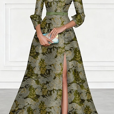 Vestido de Festa Elegante em A Linha com Jacquard Floral Vestido Formal para Casamento Comprimento até o Chão Manga Longa Decote em V Bolso de Cetim com Fenda Pregada