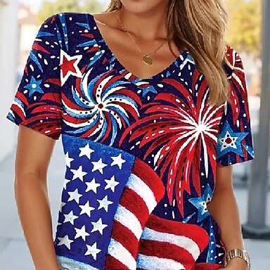 Dia da Independência Americana Mulheres Camiseta Imprimir Gráfico Letra Bandeira americana Vintage à moda Clássico Manga Curta Gola Redonda Tops regulares Diário Azul Marinha Vermelho / Azul Verão