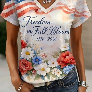 Dia da Independência Aniversário Americano Camiseta Feminina Estampada Gráfica Letra Bandeira Americana Vintage Estilosa Clássica Manga Curta Gola Careca Tops Longos Diários Azul Cinza Preto Branco