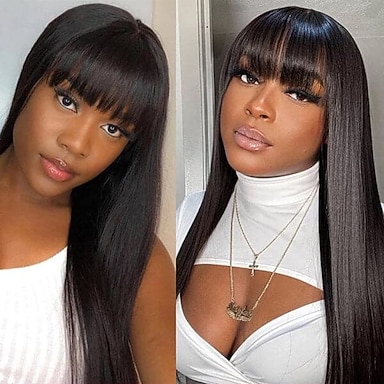 Perucas de cabelo humano liso e sedoso com franja, sem renda frontal, perucas de cabelo humano virgem 100% não processado, feitas à máquina, sem cola