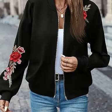 Jaqueta bomber feminina, quente, secagem rápida, bolso com zíper, elegante, moda diária, simples, floral, férias, casual, diária, feriado, curta, gola de beisebol, ajuste regular, manga comprida,