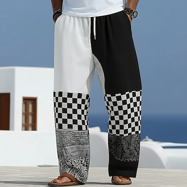 Homens Xadrez Quadrados Estampa Geométrica Calças Calça casual Calças largas Cintura Média Moda Casa Ao ar livre Férias Cintura elástica com cordão Calças de linho com bolsos Verão Primavera