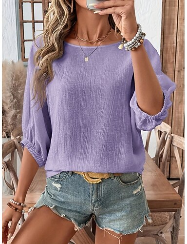 Mulheres Camiseta T-shirt Tecido Moda à moda Clássico Manga 3/4 Manga lanterna Decote Canoa Tops regulares Diário Para Noite Final de semana Branco Amarelo Roxo Damasco Verão Primavera