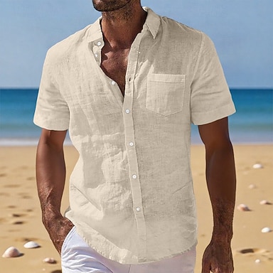 Homens Camisa de linho camisa de verão Roupa de Praia camisa de botão Tecido Casual Férias Preto Branco Azul Marinha Azul Céu Manga Curta Aberto para a Lateral Verão Roupa Bolsos