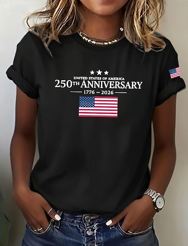 Camiseta patriótica feminina do Dia da Independência 250º aniversário americano estampa gráfica de bandeira estilosa clássica casual manga curta gola careca tops regulares diários azul preto vermelho