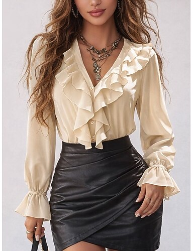 Mulheres Camisa casual camisa de botão Blusa Frufru Côr Sólida Elegante à moda Casual Manga Longa Decote V Tops regulares Diário Ao ar livre Feriado Damasco Primavera Outono