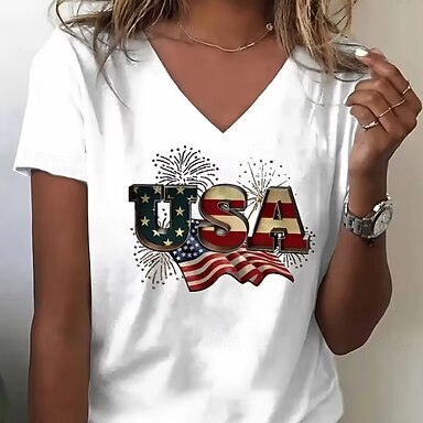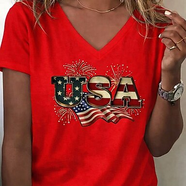 Dia da Independência Americana Mulheres Camiseta Imprimir Gráfico Letra Bandeira americana à moda Clássico Casual Manga Curta Gola Redonda Tops regulares Diário Preto Verão Primavera