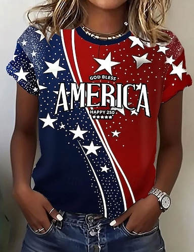Dia da Independência Americana Mulheres Camiseta Imprimir Gráfico Letra Bandeira americana à moda Clássico Casual Manga Curta Gola Redonda Tops regulares Diário Azul Preto Branco Vermelho Verão