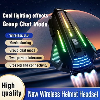 Fone de ouvido Bluetooth sem fio 6.0 para motocicleta, intercomunicador para capacete com modo de bate-papo em grupo, luzes RGB estilosas e compartilhamento de música. &Conexão entre marcas, sistema
