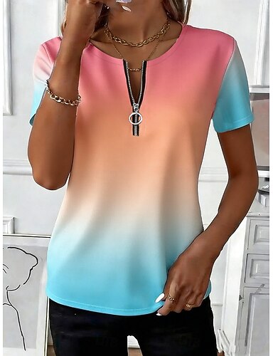 Mulheres Camiseta Zíper Gráfico Geometria à moda Clássico Casual Manga Curta Gola Redonda Tops regulares Diário Final de semana Azul Rosa Verde Cáqui Verão Primavera