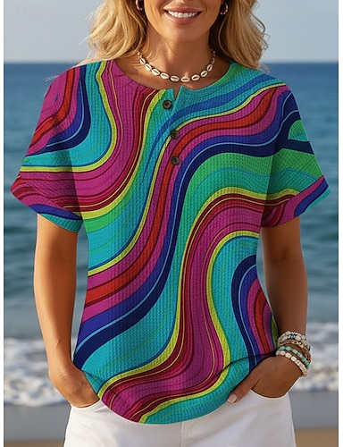Mulheres Camiseta Imprimir Botões no peito Gráfico Geométrica Listrado à moda Clássico Moderno Manga Curta Henley Tops regulares Diário Arco-íris Verão Primavera